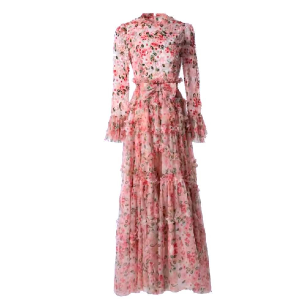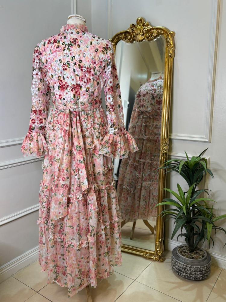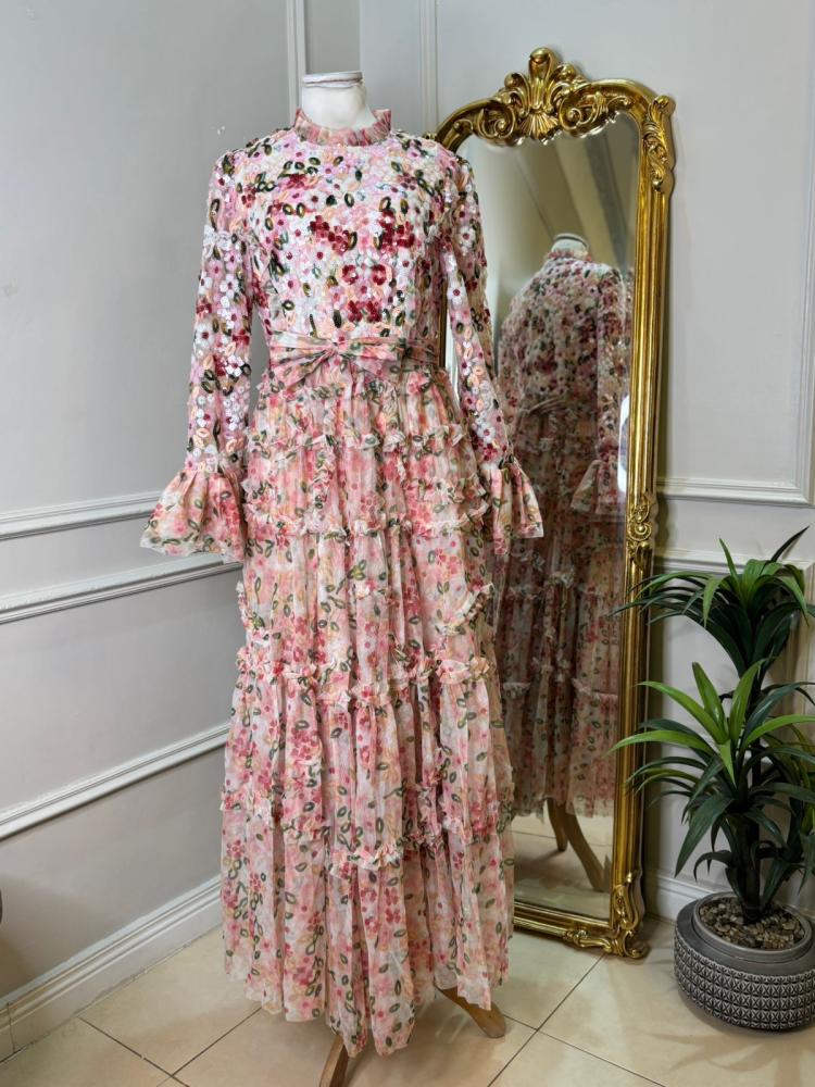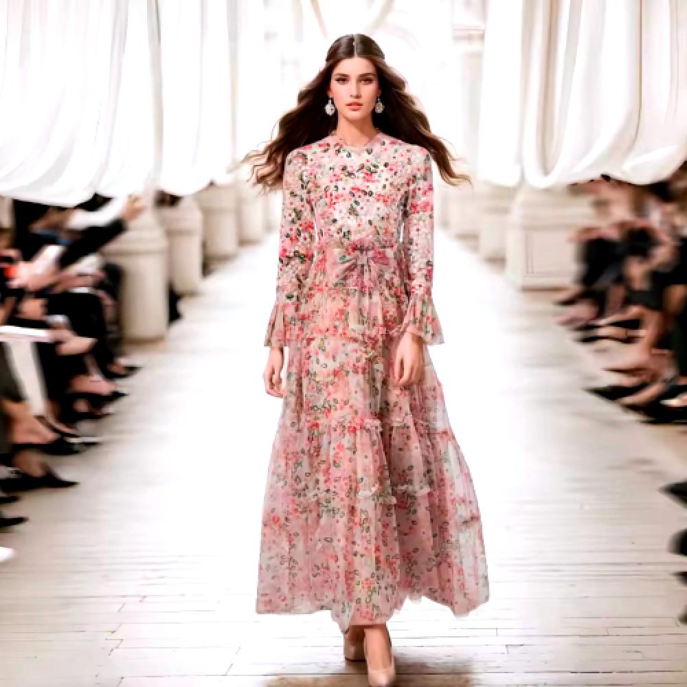 إطلالة أنثوية راقية تكتمل مع هذا الفستان الطويل المزين بطبعات وردية ناعمة