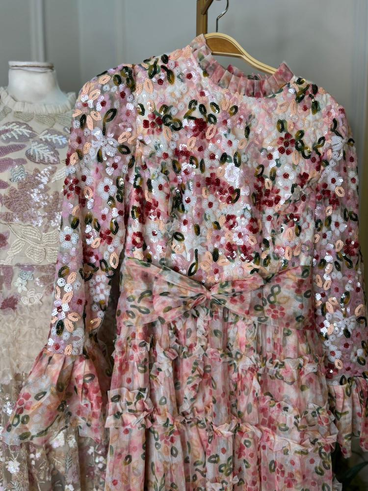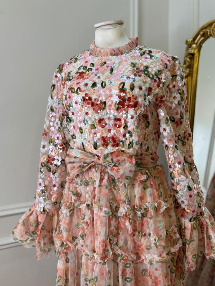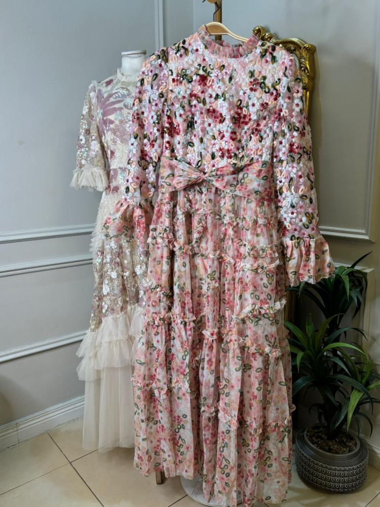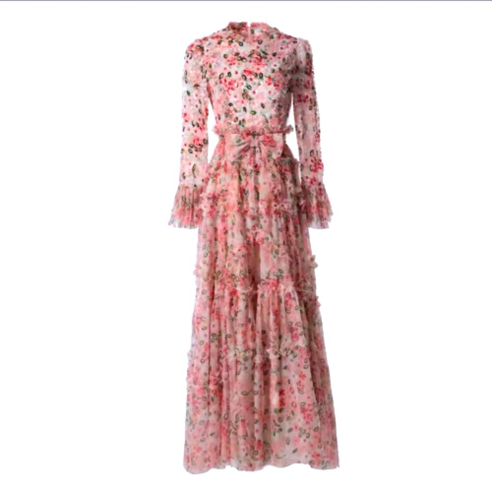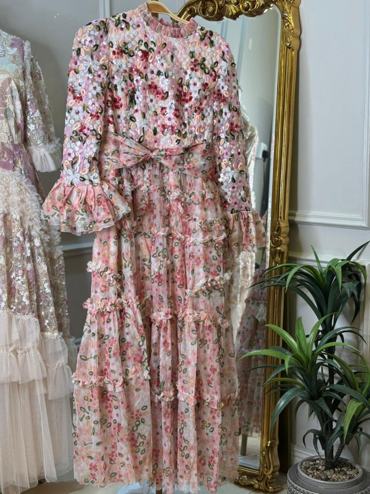 إطلالة أنثوية راقية تكتمل مع هذا الفستان الطويل المزين بطبعات وردية ناعمة