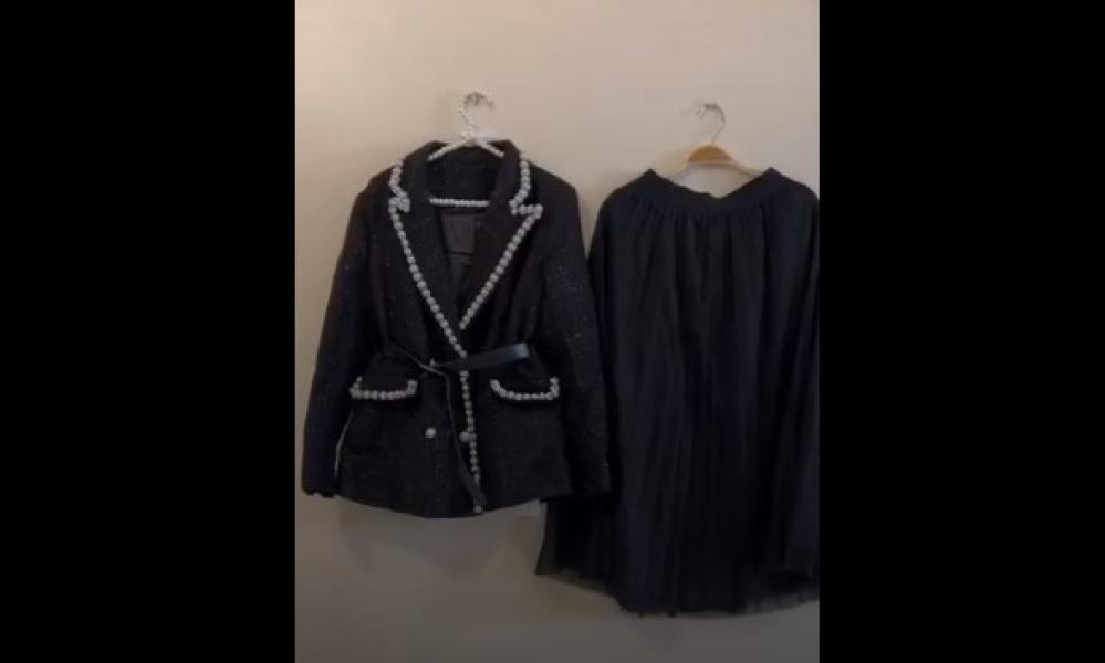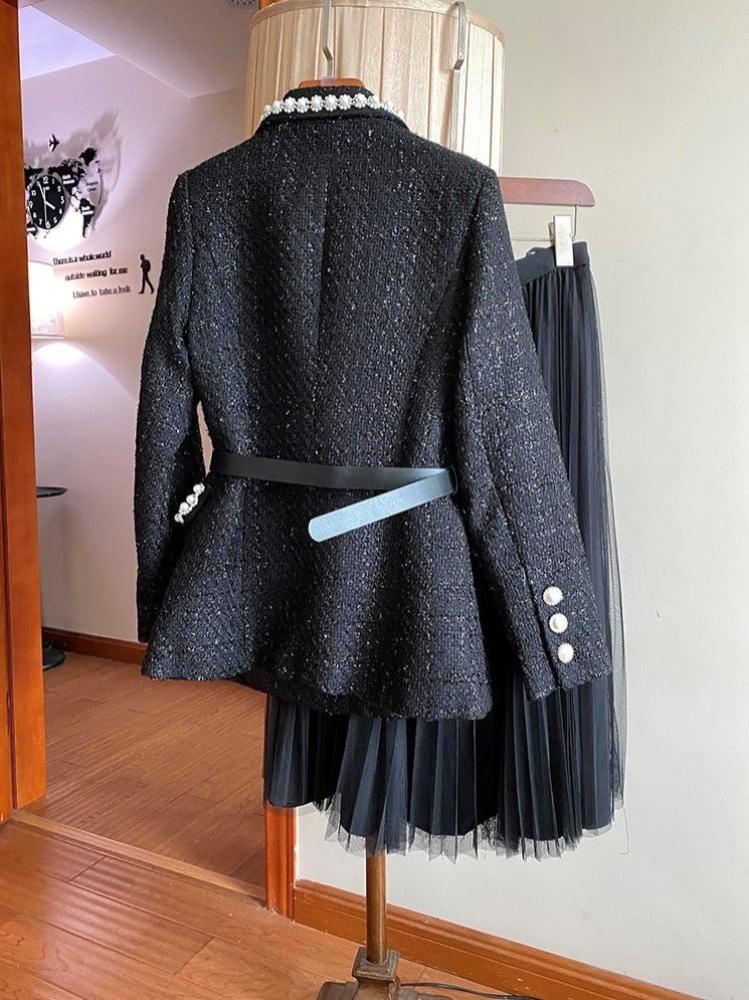 مكون من قطعتين جاكيت تيود مزين باللؤلؤ مبطن بالساتان لمسة دفء وجاذبية ..باللون الأسود الأنيق .