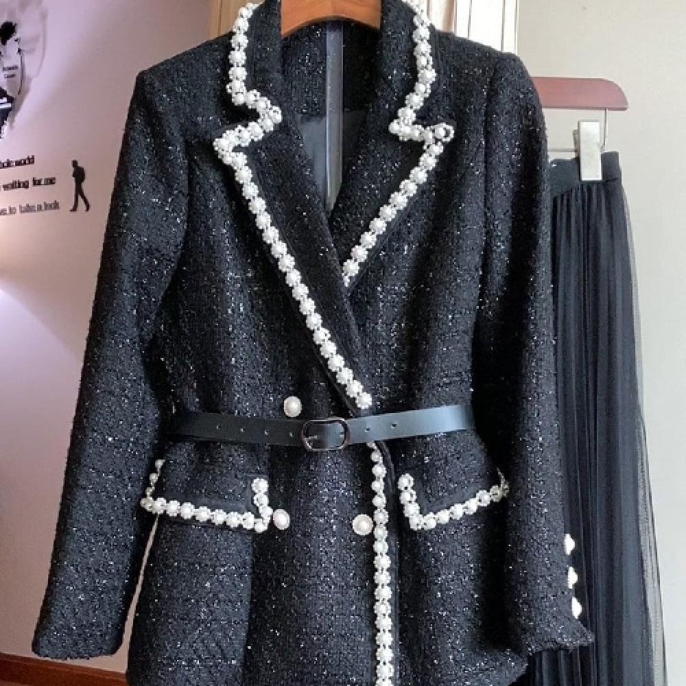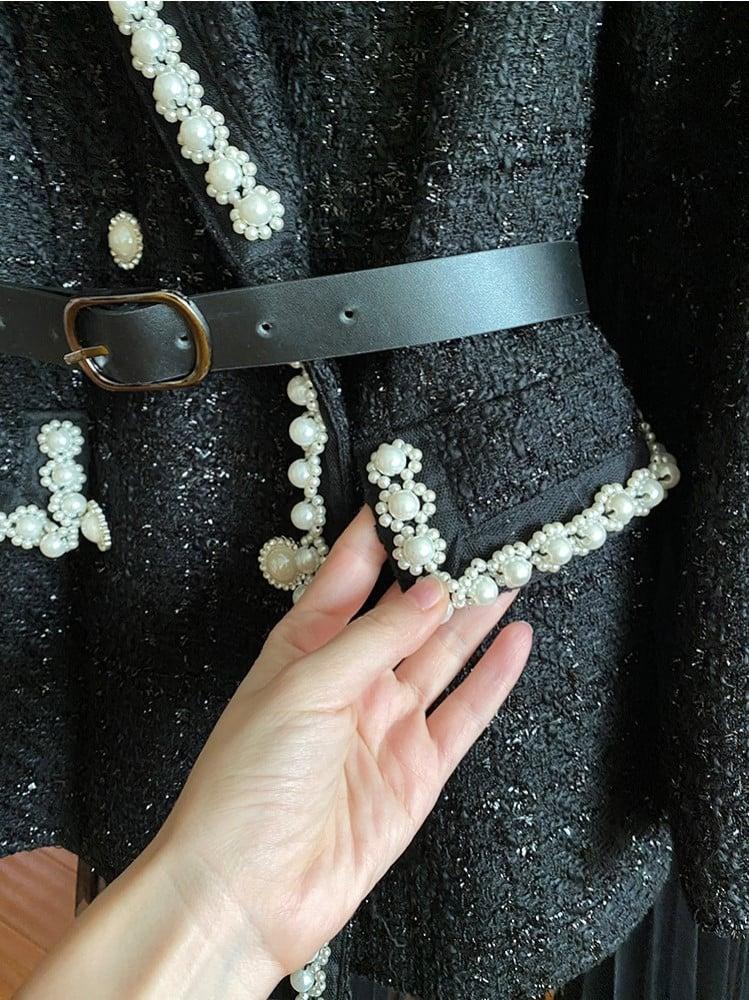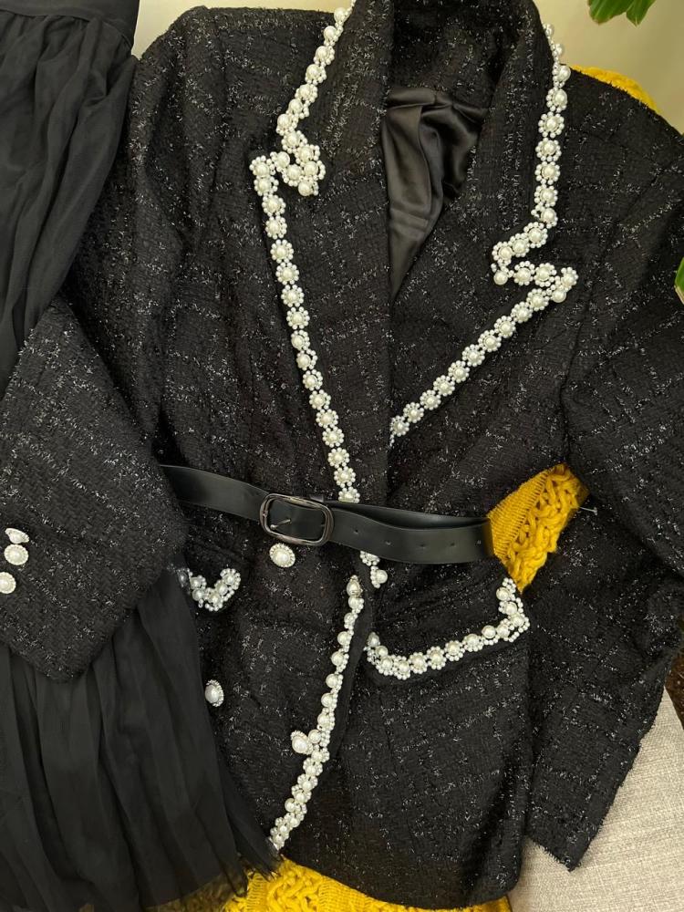 خامة عالية الجودة اطراف الجاكيت مزينة بحبات اللؤلؤ مع حزام من الجلد ..